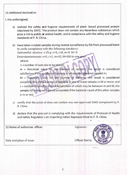 3.輸華菜籽粕應進行理化指標、重金屬、農藥殘留、微生物、真菌毒素、放射性殘留等項目檢測,并隨附EIC出具的“安全衛生聲明”(樣本見附2)。